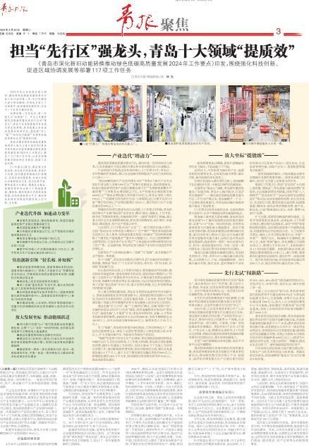 坚决扛牢先行区建设“强龙头”使命,全市绿色低碳高质量发展态势更加强劲。今年以来,市发展改革委发挥市绿色低碳高质量发展先行区建设领导小组办公室作用,推动召开领导小组会议,健全督查、推进、信息、考核等工作机制,印发《青岛市深化新旧动能转换推动绿色低碳高质量发展2024年工作要点》,推进117项年度重点任务,累计出台70余项支持政策,深化省先行区建设综合性区域、产业园区和企业三类试点实施,高质量推进省市绿色低碳高质量发展重点项目建设,工业互联网等8个集群获评省支柱型雁阵集群。截至目前,国家、省赋予青岛的先行先试任务过半取得突破性进展,年度重点工作扎实推进,相关工作获《经济日报》《大众日报》等媒体刊发。