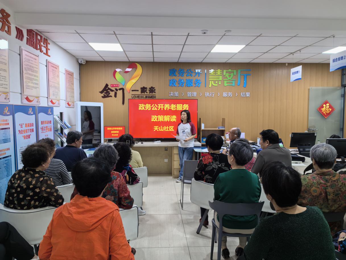 为认真贯彻落实国家和省、市、区政务公开工作要点关于常态化开展政府开放日活动的部署要求,畅通政民互动渠道,提升政务公开工作水平,金门路街道通过线上、线下相结合的形式,组织开展“政府开放日”活动,不断提升群众知晓度、满意度。其中5月24日,金门路街道在天山社区政务服务慧客厅开展了政府开放日惠民政策宣讲活动。活动现场居民参观了社区政务服务慧客厅,听取了相关养老政策宣讲,现场共有30余名居民参加活动。
