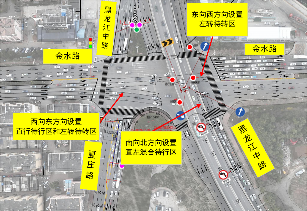 (四)夏庄路右转金水路车辆及黑龙江中路左转金水路车辆只需观察各自来向道路信号灯,在进入路口后请快速有序通过,无需再观察路口内信号灯。