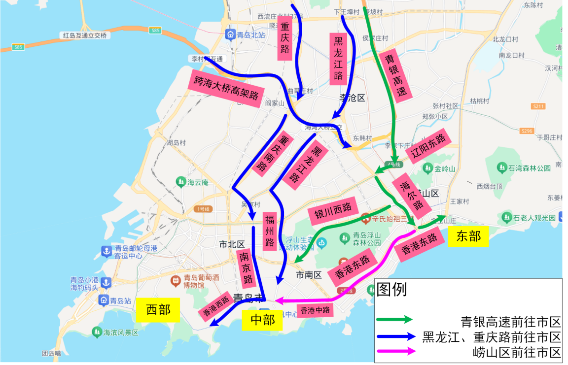 东部(小麦岛—石老人区域):跨海大桥高架路→海尔路→香港东路。