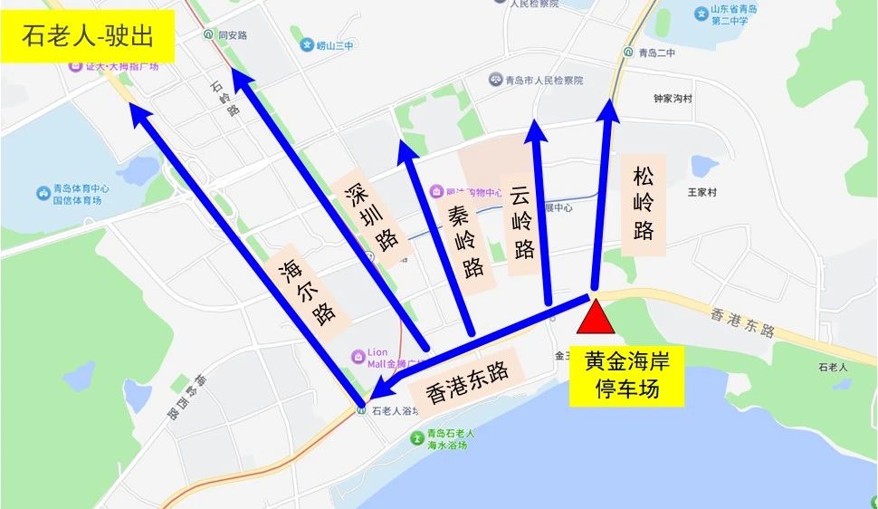 驶出:黄金海岸停车场→香港东路→海尔路/深圳路/松岭路/秦岭路/云岭路