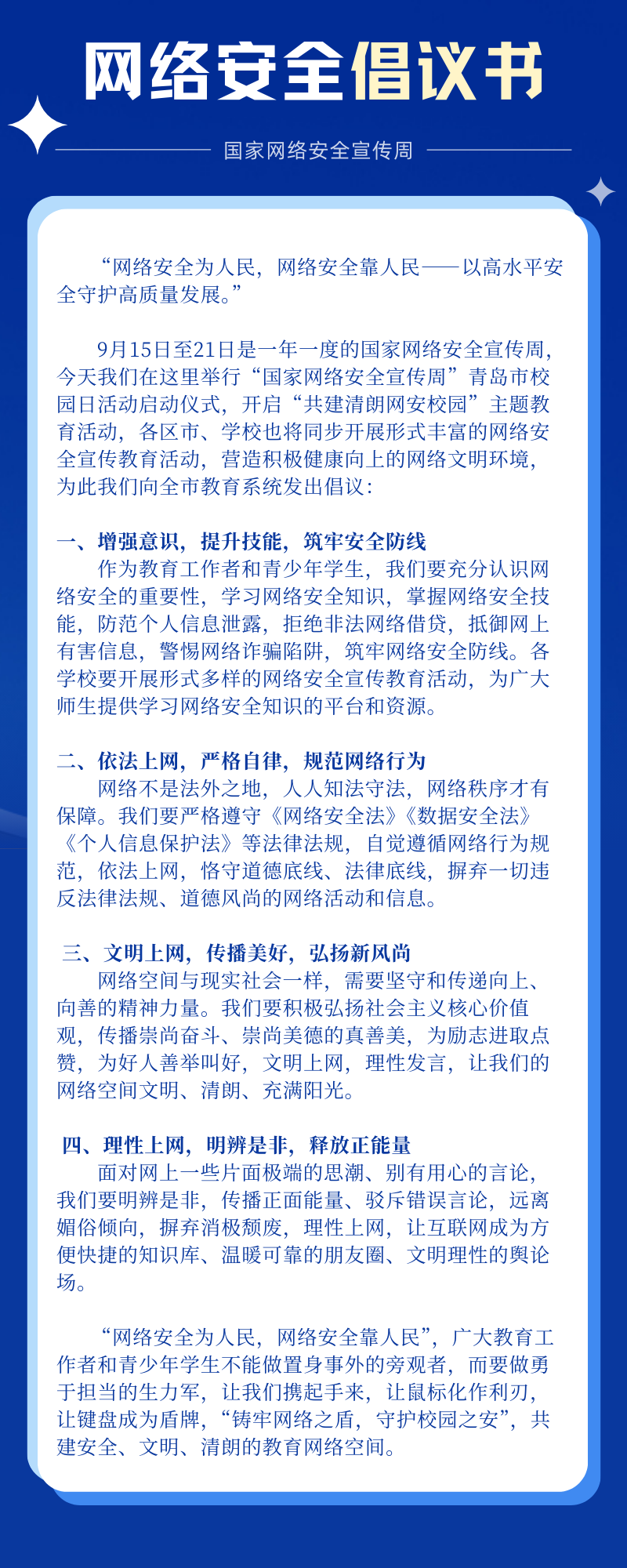 活动期间,市教育局还发出了《网络安全倡议》,号召全市各级各类学校积极开展“六个一”系列活动:观看一堂反诈网络大课,组织一场网络安全专题活动,开展一次网络安全知识宣讲,进行一次网络安全风险排查,创作一批网络安全创意作品,形成一批网络安全数字资源,以更接地气、更灵活的方式,开展形式多样、贴近师生生活的网络安全宣传教育活动,吸引广大师生积极参与、学有所获。