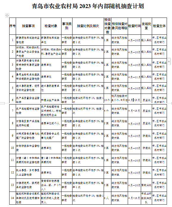 附件:1.青岛市农业农村局2023年内部随机抽查计划