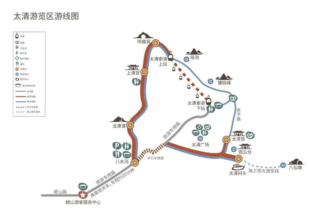 推荐线路①(乘索道上山):崂山(大河东)游客服务中心乘坐景区观光车→八水河广场下车→步行醉美山海木栈道→太清宫→沿老子路步行或在太清广场乘坐观光车至太清索道(上行)→明霞洞→上清宫→龙潭瀑→八水河→八水河停车场乘观光车→崂山(大河东)游客服务中心。