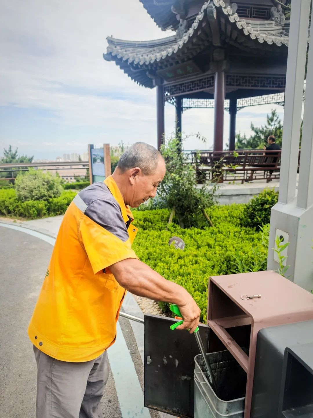清晨6点,当大多数人还在睡梦中,养护工人已开始一天的忙碌:工人们打捞湖面漂浮物,确保水域清澈;团队穿梭林间除草修剪,呵护每一寸绿意。尽管高温让他们的工作服湿了又干、干了又湿,但他们始终坚守岗位,用实际行动诠释着“爱岗敬业”的责任担当。