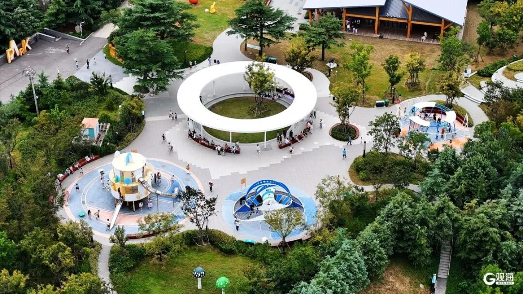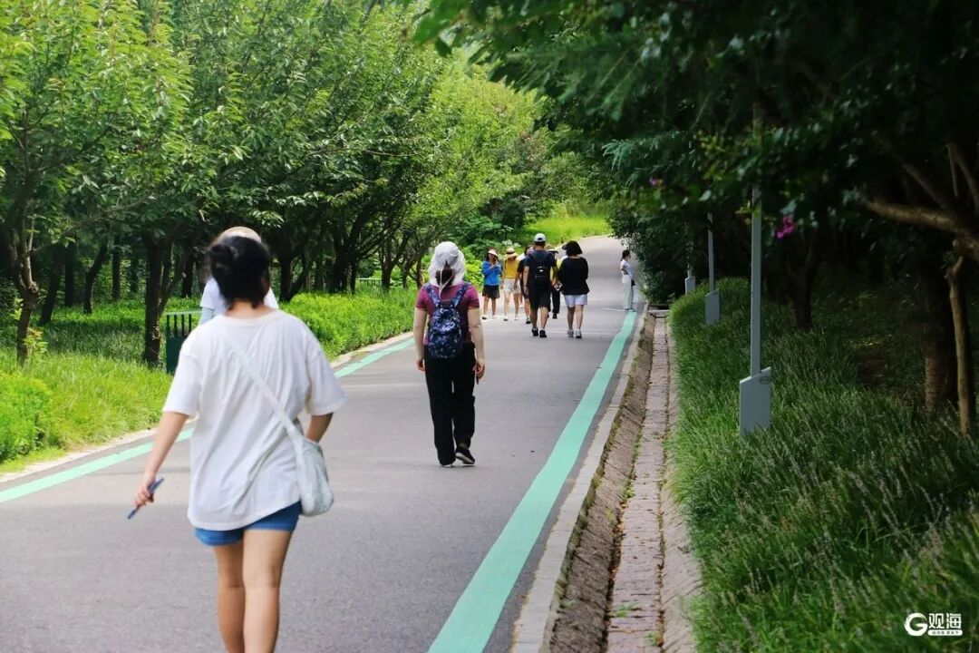 蜿蜒的木栈道依山而建,行人缓步而上,脚下木板轻响,抬头便是层叠绿荫;绿道上,有人骑着单车穿梭,衣角被风掀起,笑声落满林间;草坪空地上,孩子们嬉闹奔跑,几顶帐篷搭在其间,亲朋好友们闲谈畅聊;不远处游乐场里,满是孩子的雀跃呼喊,家长们坐在长椅上,笑着看孩子撒欢。