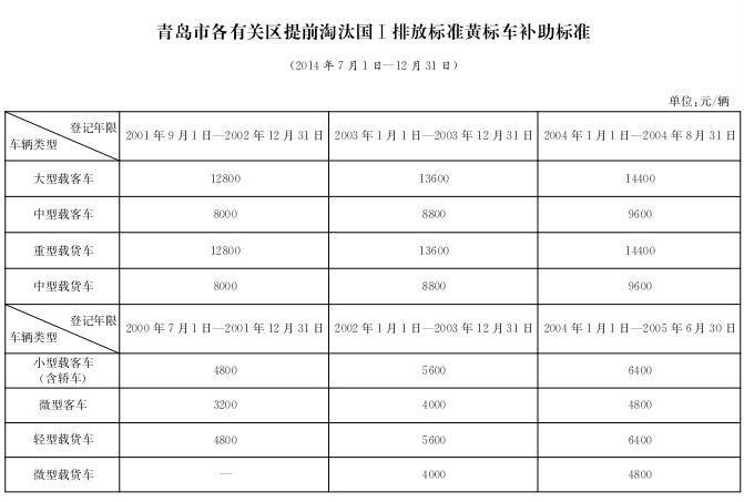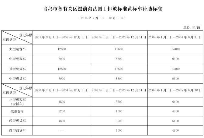2.青岛市各有关区提前淘汰国 Ⅰ 排放标准黄标车补助标准(2014年7月1日—12月31日)