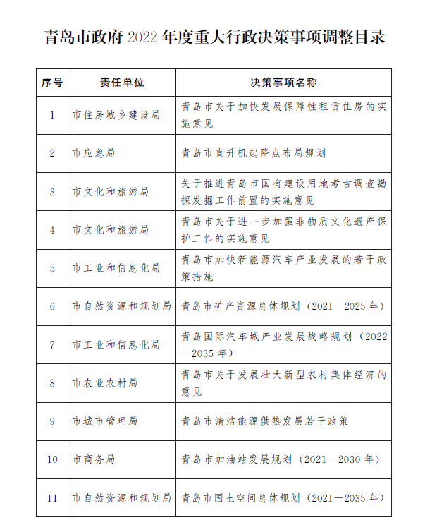2022年3月30日,市政府办公厅发布了《关于公布青岛市政府2022年度重大行政决策事项目录的通知》,对11项年度重大行政决策事项实行目录清单管理。根据《青岛市重大行政决策程序规定》(市政府令第271号)有关规定,经市政府同意,结合工作实际,决定对2022年度重大行政决策事项目录调整如下: